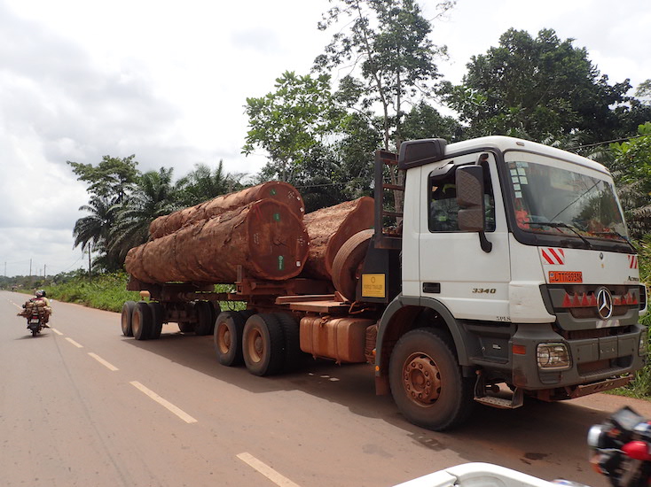 Dál na sever devastovaná savana poměrně rychle přechází v celkem pěkný, i když spíš sekundární prales. Projíždíme podél hranic Národního Parku Odzala, ale prales pokračuje i dál na sever. To, že už nejde o chráněné území, se dalo docela dobře poznat podle nových širokých dřevařských cest, které prales protínají kolmo na hlavní silnici a které tu stačily vzniknout za pouhý půlrok od naší minulé cesty. Těžbu dřeva v této části světa pandemie nijak neochromila. Některé náklaďáky, které míjíme v protisměru, jsou naložené třemi, dvěma, nebo i jen jediným kusem kmene. Několikrát jsem si říkal, jestli jsem vůbec kdy v životě tak obrovský strom viděl jinak než naložený na některém z těch aut.