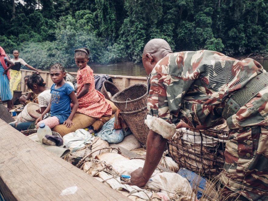 Malé pirogy, které míjíme, jsou naložené čerstvými i uzenými rybami. Naši rangeři (tady se jim říká ecoguardi) několik pirog zastavili, aby náklad překontrolovali. V kupě páchnoucích ryb se může občas skrývat i něco víc. Ale to samozřejmě ani náhodou není případ lodi, kterou teď zrovna zastavujeme! Všichni pasažéři se tváří jako nejlepší kamarádi, úsměv od ucha k uchu, jako když se rádi vidíme. Kyselé a rozmrzelé obličeje se na obou stranách objevují většinou jen jen na zlomek okamžiku, aby si nikdo nevšimnul. Dieng, jeden z našich rangerů, pobaveně vypráví o tom, jak jednoho z těch rybářů nechal za pytláctví zavřít na 3 roky. Ten mezitím přehrabuje ryby a laškovně nám nabízí jeden z čerstvých úlovků. Nejspíš i díky tomu prohlídka netrvá příliš dlouho. Claude, druhý z rangerů, prohlásil náklad za čistý, rybu uložil na naši loď, vesele se loučíme a vyhlížíme příští pirogu. V jedné z osad nás podarovali cukrovou třtinou a další rybáři se dělí nejen o úlovek, ale i o užitečné informace o skupině kamerunských lovců, které viděli výš proti proudu řeky.