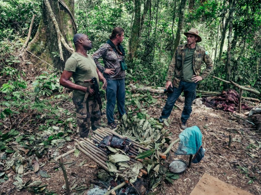 Druhý den plavby jsem se už pomalu namísto sledování každého stromu, jestli na něm něco zajímavého nesedí, začínal podvědomě sledovat každý záhyb řeky, jestli už tam budem. Vůbec jsem si nevšimnul maličké pirogy, která byla zakotvená v ústí úzkého potůčku. Ani mě to neprobralo z mikrospánku, když v tom místě zastavujeme a dva z rangerů docela potichu vybíhají nahoru do svahu, každý trochu jiným směrem. Ale nebyli jsme dost nenápadní. Nacházíme už jen nahonem opuštěný kemp. Na doutnajícím ohništi se udí kusy ryb a masa. Na zemí kolem se válí po domácku vyrobené patrony a kovová oka, několik rozporcovaných štětkounů a jeden kančil. Rangeři všechno dokumentují a posléze pálí. Část masa skončila v ohni, další naházeli do řeky, zbytek nakládají na jejich pirogu, kterou odvážíme s sebou. Boty, které si pytláci nestačili obout, rangeři rozřezali na kusy, společně se vším ostatním vybavením kempu. Lovci sice unikli vězení, ale myslím, že na tenhle výlet do divočiny jen tak brzy nezapomenou.