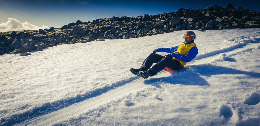 Dnešní den je ve znamení výstupu na ledovec Snæfellsjökull. V Ólafsvíku odbočujeme na cestu, která je po pár set metrech značená jako neprůjezdná, což nás ovšem nemůže zastavit. Ujedeme ještě dobré 3 kilometry, než dojedeme k úseku, který už opravdu neprojedeme, protože silnicí protéká čerstvě vyerodovaným zledovatělým korytem menší řeka. Zapíchnem Ragnara u kraje cesty a dál pokračujeme pěšky. Celou cestu do nás pálí slunce, takže paradoxně na ledovci zažíváme největší vedro. V sedle pod ledovcovým hřebenem vytahujeme nejdůležitější kus výbavy, který sebou z Brna táhneme – červenou lopatu a sjíždíme po mokrém sněhu svah. Po návratu k autu Honza zkušeně zatůruje a zahrabáváme se do mokrého písku. Ještě že máme lopatu, odhrabáváme kola a poté se nám podaří auto rozhoupat a vyjet.