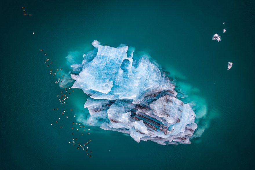 Počasí v okolí ledovce nabralo arktický charakter, proto sice u slovutného ledovcového jezera vytahuju flájboje, ovšem pilotuju v mírném sněžení z kabiny vyhřátého auta. Dá se dolítnout těsně ke kajkám mořským plujícím na hladině mezi velkými krami a ty se překvapivě vůbec nebojí, zřejmě dron považují za nějakého divného ptačího kolegu. Marek mezitím mizí v dáli a zhruba za hodinu se vrací doprovázen hejnem tuleňů, kteří se k němu cestou přidali.