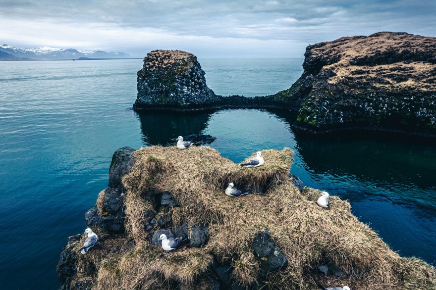 Poté pokračujeme dál po jižním pobřeží poloostrova Snæfellsnes, po cestě točíme z dronu průjezd lávovým polem a navečer, jak už začíná být našim dobrým zvykem, se vydáváme na menší trek po malebné části rozeklaného pobřeží z Arnarstapi do Hellnaru. Útesy s ptákama, mezitím lítačka s flájbojem, pak rychlý přejezd na zakempení u majáku Svörtuloft na nejzápadnějším cípu poloostrova. Vzhledem k naprosté absenci turistů nás docela překvapilo, co v téhle bohem zapomenuté díře dostupné jen přes příšernou cestu lávovým polem dělá Dacia Duster se střešním stanem. Další den ráno se celou bizardní historku máme dozvědět, ale teď jsou asi tři hodiny v noci, tak spokojeně usínáme.