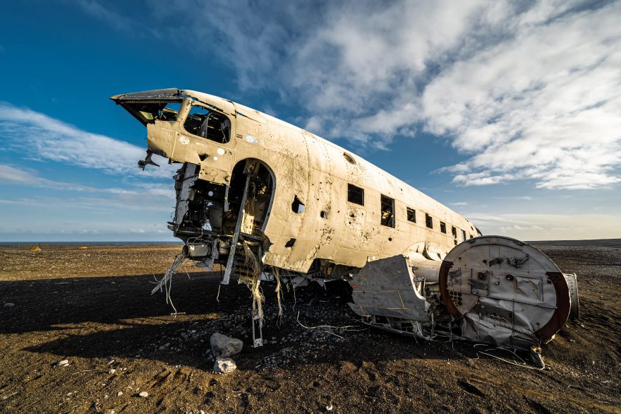 Opět kousek popojíždíme a vydáváme se k legendárnímu vraku letadla na černé pláži. Cesta sopečnou pouští ve vichru je jako zenové cvičení, ale za tři čtvrtě hodiny na nás zpoza duny vykoukne jako plechová zdechlina velryby bílá střecha letadla. Chvíli máme letadlo jen pro sebe, takže fotíme jak draci, nicméně záhy se objevují další dva týpci s foťákama a dronama a taky náš starý známý Ital ze zabouchnutého auta. Přestože je pořád silný fičák, vzlítám s flájbojem a překvapuje mě, že se vůbec udrží ve vzduchu. Koordinace přesných pohybů při vylétnutí z trupu letadla je poměrně náročná, ale obejde se bez havárie. Končí zlatá “hodinka” a my vyrážíme k autu, abychom za světla dojeli k našemu nocležišti u Skógafossu s výhledem rovnou na vodopád.