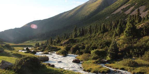Za vesnicí jsme si všimli, jak mnohoúčelové vozidlo může být obyčejná Lada Niva: jednou v ní vezli tři ovečky na porážku, podruhé za ní táhli kládu, potřetí se v ní vezla narvaná celá rodinka. Polní cesta podél řeky Arašan lemovaná meruňkami vás potom zavede do ústí údolí, odkud pak stoupá vzhůru divokými smrkovými lesy. Říční soutěska je místy pořádně zaříznutá a temná. Teď při vyšším stavu vody byla cesta dokonce místy trochu zaplavená. S nabírající výškou se postupně objevují mýtiny a cesta pak vede ve strmém srázu vysoko nad řekou.