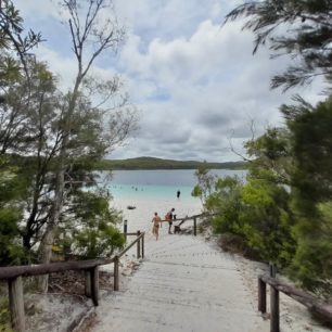 Trajektem z výběžku Inskip na Rainbow Beach (jižní cíp), vzdálenost cca 1 km