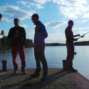 Zde je vše jako obvykle, ohniště, toalety, přístaviště a hlavně krásná příroda, klid a pohoda. Jíme vynikajícího zakoupeného lososa a mezi tím se snažíme ulovit ryby pruty, které nám naši průvodci vypůjčili, bohužel neúspěšně. Naštěstí ale máme zásobu piva, které nám dává na neúspěšný lov brzy zapomenout a bílá noc nám zase dává zapomenout na čas, takže jdeme spát docela pozdě.
