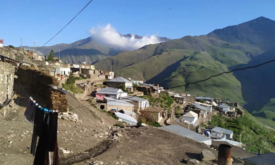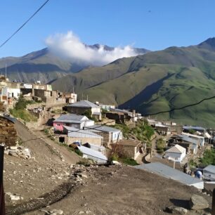 Naopak širokému údolí pod námi jasně dominoval hluboký a stržemi rozervaný kaňon, po jehož vrcholu se klikatila zatím jediná autem sjízdná cesta směřující do vesnice Khinalyg. V odpoledních hodinách se po prašné cestě k našemu velkému údivu sunula spousta aut. Až později jsme zjistili, že vesnice Khinalyg se stala jednodenním výletním místem ázerbájdžánských turistů přijíždějících do tohoto izolovaného horského kraje udělat si několik selfíček, vyfotit si nádherná okolní pohoří, snad krátce navštívit jedno ze dvou místních malých muzeí a do hodiny zase zmizet do civilizovaného města Quba. Vesnici zatím chyběla jakákoliv turistická infrastruktura. Až na několik lokálních guesthausů, což obnášelo bydlet a stravovat se doma u některé z místních rodin, zde nebyla jediná restaurace ani hotel. Pro nás se vesnice stala na několik dalších dnů příjemnou zastávkou putováním horami.