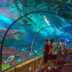 Když se po přechodech propletete na druhou stranu, octnete se na začátku Port Vell, Starého přístavu, a zjistíte, že Rambla pokračuje dál! Není to už honosný bulvár, nýbrž dřevěná lávka se zvlněným ocelovým loubím, v němž je zasazeno veřejné osvětlení. Jmenuje se Rambla del Mar a s historickou Ramblou vlastně nemá kromě jména nic společného, ale na druhou stranu je to její logické pokračování. Barcelona jako by se tu konečně jednoznačně přihlásila také k moři, na jehož břehu leží. A to přihlášení je hned dvojí. Na konci mola Espanya, kam Rambla del Mar ústí, už totiž čeká Lʼaquàrium, největší veřejné akvárium na světě věnované Středozemnímu moři. Příležitost podívat se do takového zařízení si nemůžete nechat uniknout.
