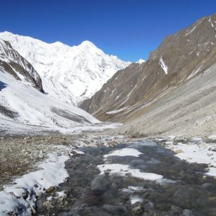 Hory prostě občas kladou překážky, s tím se musí počítat. Ráno není veselejší večera, smeteme sníh ze stanů i z kapucí a přece jen vyrážíme správným směrem, pod správné sedlo. Přeskakujeme potůček v soutěsce z jedné strany na druhou, lehce sněží, cesta je tu jasná, jakkoliv proti proudu, optimismus ve skupině žádný. Doufám v zázrak a v krásné počasí ráno, jinak skupinu nezformuji k pokus o přechod.