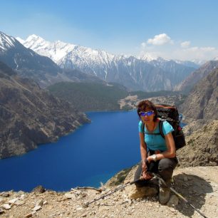 Po zaříznuté stezce ve skále nad jezerem pokračujeme na jeho severozápadní cíp. Místy jsou to jen na pohled křehké úzké lávky, které však unesou stáda jaků, což nám připadá neuvěřitelné. Vybavují se nám záběry z filmu Karavana, kde jaci spadli do tyrkysových vod jezera. Po dvou hodinách se dostáváme na severní okraj jezera, kde nocujeme pod majestátní horou Kanjirowou.