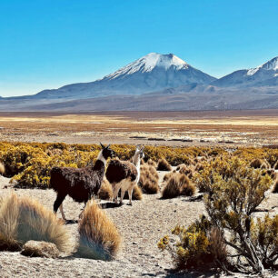 Dál naším směrem už možnost přesunu veřejnou dopravou končí, i do lokálního střediska Patacamaya, vzdáleného odsud něco víc než kilometr, je třeba dojít pěšky. Městečko nejdřív vzbuzovalo lehké rozpaky, ale netrvalo dlouho a podařilo se nám domluvit si odvoz do našeho dnešního cíle, téměř 200 kilometrů vzdálené Sajamy, vesnice uprostřed stejnojmenného národního parku. Přidala se k nám ještě postarší baskická Španělka a to i se svým kolem, se kterým je odhodlaná dojet až na samý jih Patagonie. Jméno Sajama ale nenese jen vesnice a národní park, ale taky místní dominanta, nejvyšší hora Bolívie, 6 542 metrů vysoká vyhaslá sopka. Neujeli jsme ani 50 kilometrů a už se zjevila na jihozápadním horizontu a po další téměř týden byla k vidění prakticky odkudkoliv, kam jsme se hnuli. My jsme ale přijeli s úmyslem pokusit se vystoupat na protilehlý, zhruba o 200 metrů nižší stratovulkán Parinacota. Jeho téměř dokonale symetrický tvar mě zaujal už při první cestě do této oblasti, před více jak deseti lety. Kvůli nekompromisnosti bolivijských celníků jsme tehdy na hranici museli vystoupit z autobusu a podstoupit kontrolní proceduru venku, ve výšce téměř 4 500 metrů nad mořem. S ohledem na fakt, že jsme jen o pár hodin dříve opouštěli pacifické pobřeží, jsme tenkrát změnu výšky náležitě pocítili. Jenže právě díky tomu jsem si Parinacotu, stejně jako její dvojče Pomerape, obě sopky zdánlivě na dosah, mohl náležitě prohlédnout. A myšlenka pokusit se na okolní svět pohlédnout z jejího vrcholu byla na světě.