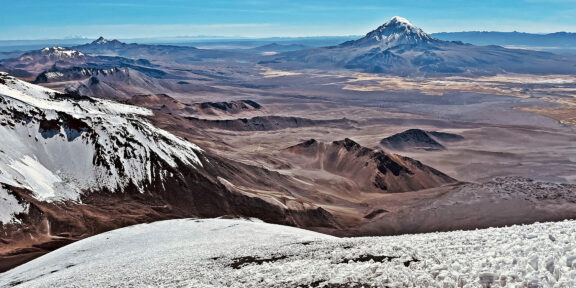 Je ještě hluboká noc, když plníme termosky horkým čajem a terénním autem se vezeme blíž k sopce. Jedeme až do sedla mezi Parinacotou a Pomerape, odkud cesta dál pokračuje do Chile. Výška lehce přes 5 100 metrů. Navlékáme na sebe všechno, co máme k dispozici, a kolem páté, ještě při světle čelovek vyrážíme. Netrvá dlouho a začíná svítat, naštěstí aniž bychom pociťovali další snížení teploty. Na druhou stranu ani postupně výš a výš po obloze stoupající slunce nikoho z nás nenutí sundat byť jen jedinou vrstvu oblečení. S narůstající výškou se nám naskýtají úžasné výhledy. Mario zvolil přijatelné tempo, stoupá se nám možná až nad očekávání dobře, přesto se naše skupinka časem dělí. Někdo má problémy v poli kajícníků, sluncem a střídáním extrémních teplot vzniklých tenkých hrotů sněhu, já naopak hlavně v ujíždějící suti a sopečném prachu. Deprimuje mě, jak po každém došlapu ztrácím část z těžce nabyté výšky. Obzvlášť závěrečný úsek je pro mě docela vyčerpávající, naštěstí už není dlouhý. Kolem poledne jsme na vrcholu, žádná euforie se ale, alespoň u mě, nedostavuje. Počasí je až na velmi silný vítr ideální a dohlednost naprosto neuvěřitelná. Dokonce i Illimani, domovský kopec La Pazu, vzdálený vzdušnou čarou možná i víc jak 200 kilometrů, vidíme naprosto zřetelně. Stejně jako nemalou část náhorní plošiny, Altiplana. Vrcholovému kráteru věnuju jen několik krátkých pohledů, k focení, vyžadujícímu sundání rukavic, se musím vyloženě přemlouvat. Sestup sopečným prachem se rychle mění ve sbíhání, zpomaluje nás jen zóna kajícníků. I tak jsme za tři a půl hodiny zpátky ve vesnici, spokojení a plní zřejmě už nezapomenutelných dojmů.