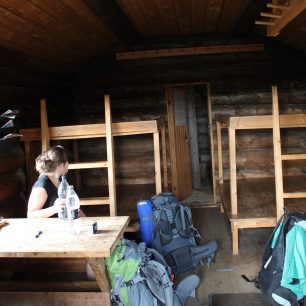 Pod chatičkou teče široká, ale mělká říčka, nikde není žádný strom, který by nám bránil ve výhledu na jakoukoli stranu. Když otevřeme dveře do chatičky, litujeme, že tady nestrávíme noc. Uvaříme si tedy alespoň oběd na plynovém sporáku a najíme se pěkně u stolu a ze skutečného hrnce. Po obědovém šlofíčku se vydáváme dál. Krajina je poměrně stejná, několikrát musíme zout boty, abychom suchou nohou přešli říčku nebo potůček.