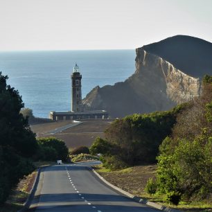 Prohlídka naučného centra mi zabrala dost času. Slunce se blížilo pomalu k obzoru a přede mnou byla ještě cesta po jižním pobřeží nazpět do Horty. Takže jsem musela oželet tříkilometrovou procházku ke kráteru. Zato jsem si ještě vystoupala k rozbořené pozorovatelně velryb, odkud se mi nabídl další zajímavý pohled na sopku a maják, který se stal mementem a jedním ze symbolů ostrova Faial.