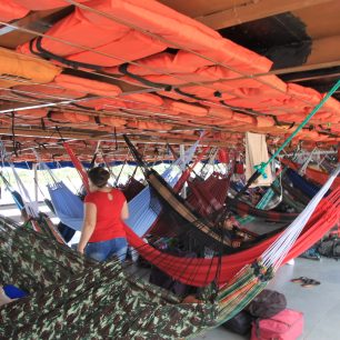 I nocování bylo jiné než na Tupaně a Igapo Acu. Hamaky jsme si nevěšeli už mezi stromy v pralese, ale využívali jsme odstavené lodě u domů farmářů, kteří naši návštěvu brali jako poctu a všem svým sousedům se hned s naší expediční samolepkou chlubili, koho to na své lodi mají ubytovaného.