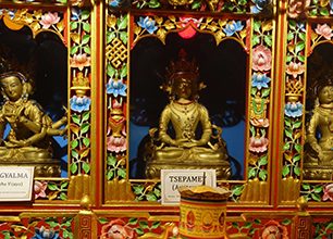 Měla by tu být škola pro 30 mladých mnichů, jeden z těch starších nás pouští do chrámu, v zadní části upoutá 5 metrová socha Maitrey, všechny zdi jsou pomalované výjevy ze života Buddhy a symbolickými motivy. Je tady i mnoho rituálních předmětů – zvonky, vonné tyčinky, misky s rýží, svitky s posvátnými buddhistickými texty. Tady malí mniši nastupují na svou duchovní cestu. Teď po nich vidíme jen pláště, které stále drží svou formu i když je mníšci opustili, jako by je u podlouhlých stolů vystřídali duchové.