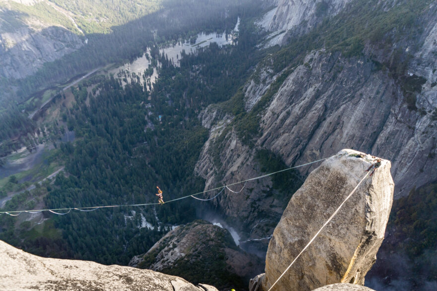 Speciální momenty, které asi všem highlinerům utkví v hlavě, jsou zábavné střety s jinými zvířaty, kteří chtějí být součástí vaší hry. Třeba u kanadského Squamishe je místo, kde se lajny tahají kousek nad oceánem a často tam tak s lajnery laškují lachtani a další mořští tvorové. Já tam jednou přímo z lajny zahlédla velrybu, což byl pro mě hodně silný moment. Nebo v Yomisetech se takhle pode mnou procházela medvědí máma s medvíďaty. Pozorovala jsem ji tehdy z jedinečné perspektivy a nemusela jsem mít ani strach. Jindy jsem zase v americké poušti pozorovala, jak těsně kolem kamaráda létají orli, kteří si jeho chůzi užívali snad víc než on. Když vás na dlouhé lajně chytne horší počasí, třeba silný vítr nebo hustá mlha, máte z chůze taky úplně jiný zážitek. Oba případy jsem zažila a často se mi ve vzpomínkách vrací. Emoce, které na lajně prožíváte jsou intenzivnější, čas taky plyne úplně jinak a vaše smysly zostří. Ta propojení s okolím jsou tak často výjimečná.