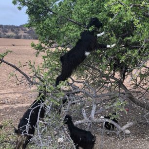 Hned za kooperativou potkáváme kozy – labužnice, jak si pochutnávají na arganových lístcích. Na silnici mezi Marrákeší a Esvírou je několik míst, kde ziskuchtiví Maročani lákají kozy do korun argánie trnité a pak od překvapených turistů inkasují za fotku poplatky. Teď ale turisti nejsou a „kozí“ stromy včetně jejich správců od silnice zmizeli. Mnohem lepší stejně je vidět kozy takhle pěkně v přírodě.