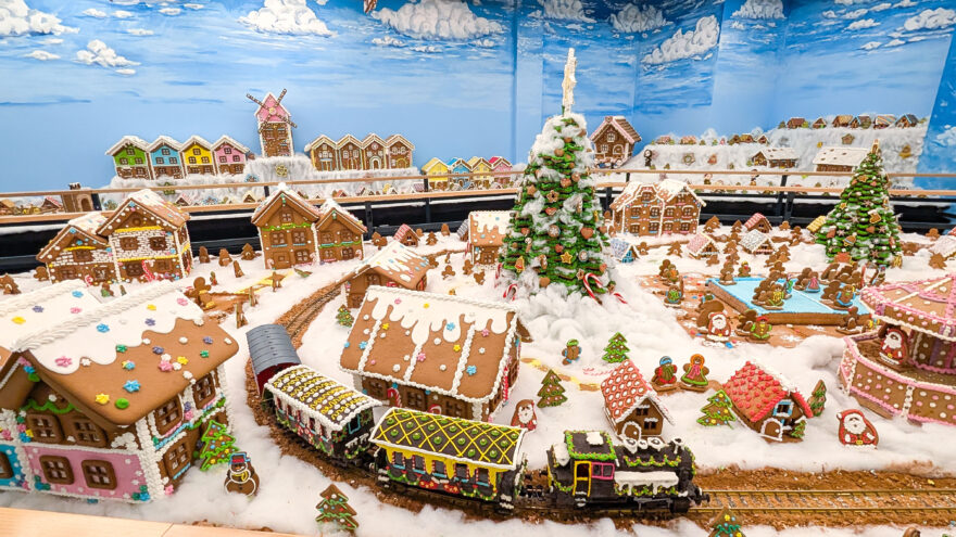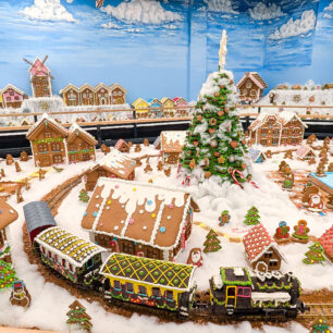 Pokud budete mít ve Vratislavi ještě cirka 1,5 – 2 hod času navíc, pozvu vás i na návštěvu Kolejkowa. Tento magický svět vláčků, a miniaturních obyvatel, umístěný v budově Sky Tower, totiž každým rokem s adventem otevírá jednu velkou místnost navíc s dočasnou výstavou Perníkové město. Na 150 m² letos pekaři vybudovali z 1,5 tuny perníku miniaturní město, zoo i pohádkové kulisy. Vláčky ozdobilo 60 kg čokolády. Voní to tu medem a skořicí, a kromě perníku tu najdete i dokonalé pohádkové postavičky z jedlého fondánu – např. Sněhurku a trpaslíka, babu Jagu, Jeníčka s Mařenkou nebo Baletku s Louskáčkem.