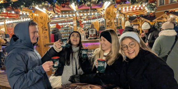 Když jsou dárky vyřešené, už nám nic nebrání vrhnout se na hodování a zábavu. Což takhle opečený teplý oštěpek? Nebo polské pirožky, alsaský slaný koláč či ukrajinský boršč? A pokud jste na sladké, jistě neminete stánky nabízející gofry (sladké vafle), trdelníky, koblihy nebo koláče. A co by to bylo za adventní trhy bez svařeného vína? V Polsku mu říkají grzaniec a na Rynku ve Vratislavi se prodávají ve velkých dřevěných větrných mlýnech v rozích náměstí. Vybírat můžete z více druhů, např. tradiční vratislavský s rumem, višňový, malinový, borůvkový, nebo si jej můžete nechat vylepšit kapkou amaretta. Případně vyzkoušejte rovnou horkou čokoládu s amarettem. Svařák i čokoláda vás vyjdou na 20 zł a automaticky vám k ceně přičtou i 20 zł jako zálohu na hrníček ve tvaru botičky, ve kterém vám svařák či čokoládu naservírují. Zálohu je třeba platit hotově a stejně vám ji vrátí při vrácení hrníčku.