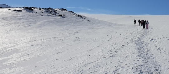 V deset hodin dopoledne nás u hotelu nabírá sympatický průvodce a v dodávce již sedí asi šest dalších lidí. Opouštíme Longyearbyen a po krátké cestě zastavujeme na úpatí nedaleké hory. Z otevřeného kufru si bereme sněžnice, přilby a čelovky a když průvodce ukazuje, kam jdeme, jímá mě hrůza.