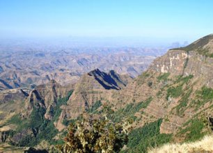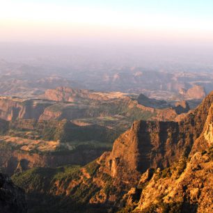 Úzké pěšinky nás vedly podél hlubokých propastí, na jejichž dně jsme viděli malé vesničky a pole a procházeli jsme mezi tlupami obrovských opic, dželad, které nás naštěstí vytrvale ignorovaly a dál se cpaly trávou. Simien má, podobně jako celá střední Etiopie, ráz náhorní planiny, porostlé v zimě nažloutlou trávou, jejíž okraje se topí v oparu dálek. Více než špičaté vrcholky vám zde budou imponovat obrovské, ploché kopce, rozlámané hlubokými puklinami údolí a všeobjímající měkké světlo.