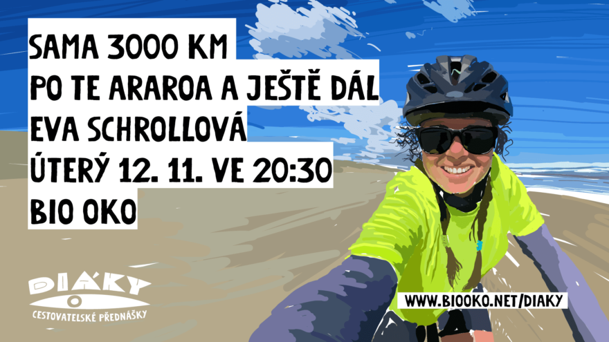 Její dobrodružná cesta přes Nový Zéland a Jižní Pacifik by vydala za tři. Jižní Ostrov přešla s blížící se zimou sama pěšky po Te Araroa (1300 km), Severní Ostrov projela po též trase na kole (1700 km). A protože jí to nestačilo, stopla si plachetnici a přeplula 2 300 námořních mil Jižním Pacifikem. O své neuvěřitelné cestě bude vyprávět už 12.listopadu v letenském kině BIO OKO v rámci cestovatelského cyklu Diáky.