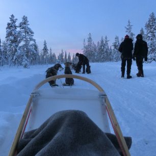 Je jasno, -31°C. Obloha hraje všemi barvami. Psi jsou zapřaženi. Na prvních 6 km si sedám do saní a přehazuji přes sebe kožešinu ze soba. Filip se staví na hranu saní s důležitou rolí navigátora a řidiče. Naše spřežení se skládá ze sedmi hbitých sibiřských husky psů s pomněnkovýma očima a urputnou nedočkavostí.