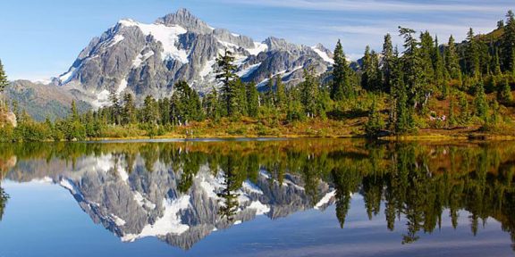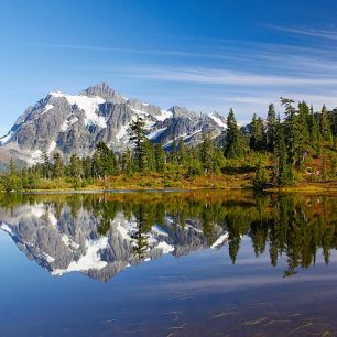 „Obrázkové jezero“ je skutečně jako stvořené pro kýčovitý obrázek. V jeho hladině se provokativně zrcadlí fešácká hora Mt. Shuksan (2783 m) v národním parku North Cascades. To všechno na dosah od kanadské hranice.
