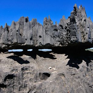 Naše první kroky vedou do Tsingy de Bemaraha. Donedávna bylo téměř nemožné toto místo navštívit, obtížná daleká cesta, dvě široké řeky, neschůdný terén. Nyní se mohou cestovatelé vydat s průvodcem aspoň po okraji 1577 km2 velkého parku a vyšplhat se až na samé špičky vápencových jehel, přidržovat se karabinami železných lanek, kráčet po vysutém mostě a užívat si pohledu na neobvyklou krajinu. Nyní je období sucha, a tak se i my kocháme krásami přírody. Až přijdou deště, kaňony i stezky se zatopí a lemuři budou mít své rejdiště zase jenom pro sebe.