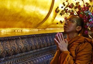Modlící se mnich ve Wat Po u nohou ležícího Buddhy.