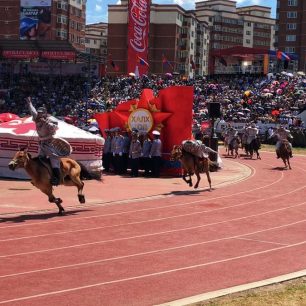Celý festival je zahájen velkým ceremoniálem na stadionu v Ulánbátaru. Skládá se z různých vystoupení a přehlídek, které mají znázornit historii Mongolska a ukázat mladším generacím jeho růst i prosperitu. Letošní přehlídka začala pohledem na mongolskéválečníky stovky let dozadu a postupně se dostala až k současné prosperující zemi. Pro mě jako pro evropana bylo asi nejzajímavější představení tradičního způsobu mongolského života – kočování, ale obdivoval jsem i umění perfektní jízdy na koni a neskutečné akrobatické dovednosti.