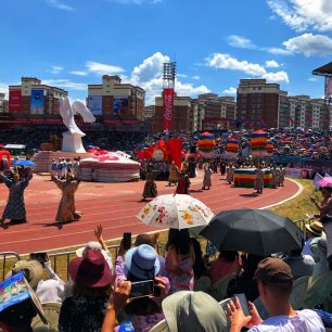 I přes úžasnou podívanou jsem byl nakonec rád, když ceremoniál skončil. Teplota na nezastíněné tribuně dosahovala ke 40 °C, a přestože jsem měl k dispozici tradičníklobouk, nebylo delší sezení na tribuně úplně pohodlné. Hned po ukončení jsme se přesunuli za město s cílem zhlédnout závody koní a strávit nějaký čas s místními v tradičních jurtách.