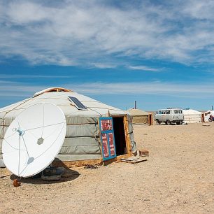 Jurty pastevců v poušti Gobi. Zrovna zde by člověk čekal nejskromnější podmínky připomínající středověk. A ono ne! Tedy přiznejme si, způsob života těchto kočovníků, jejich vaření i hygiena, to všechno ten středověk velmi připomíná. Ale do toho jim rovnýma nohama padla nejmodernější současnost. Malý solární panel na střeše jurty celý den nabíjí akumulátor, aby potom večer mohla rodina zasednout kolem televize a lovit satelitní programy.