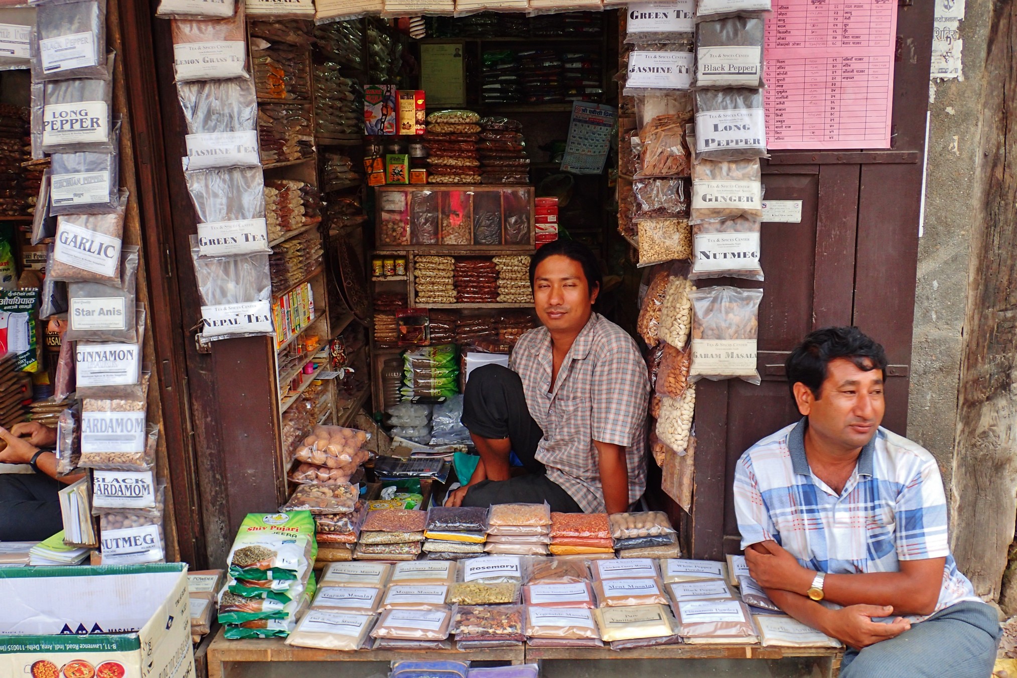 Stánek s kořením, čajem a oříšky v Káthmándú