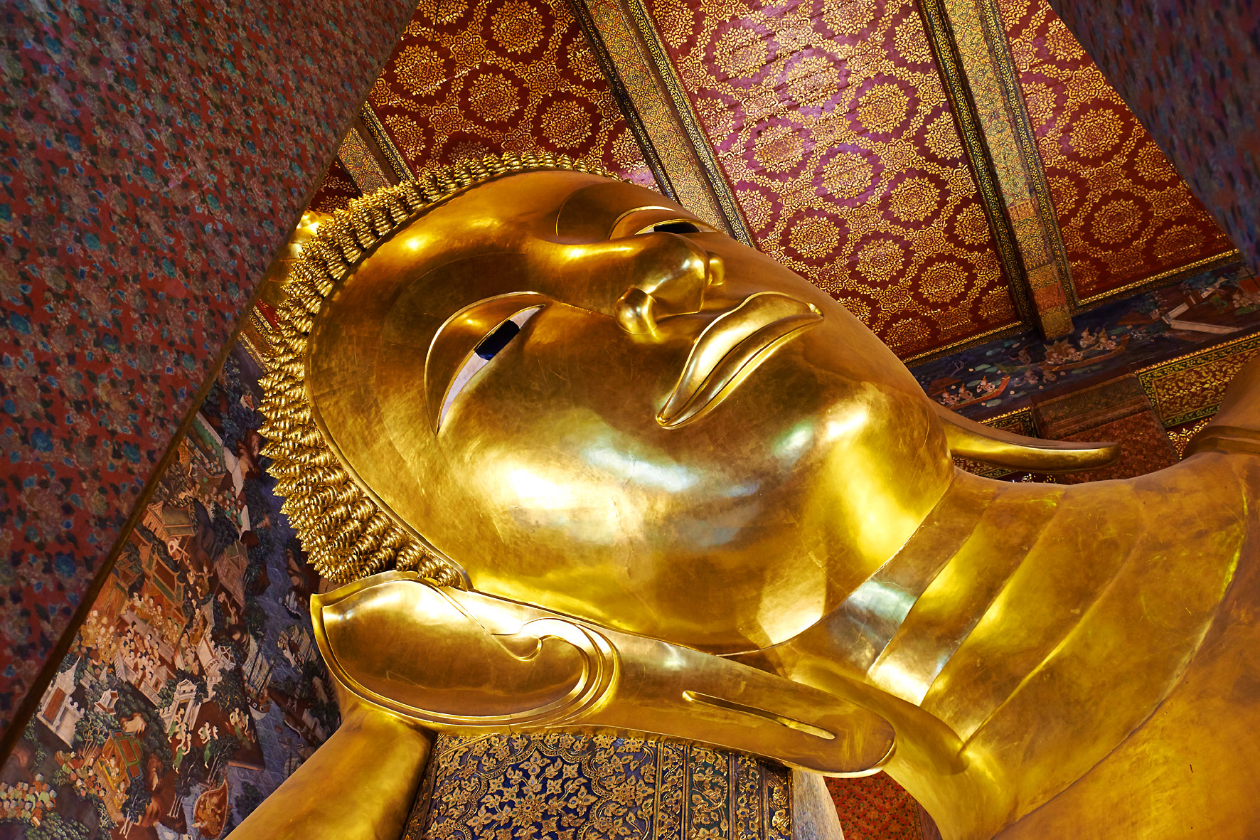 Ohromná socha ležícího Buddhy v Bangkoku ve Wat Po. Thajsko