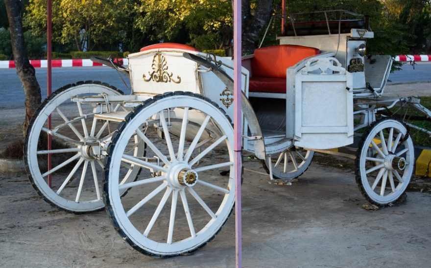 Staré drožky čekající na zákazníky, Pyin Oo Lwin, Myanmar