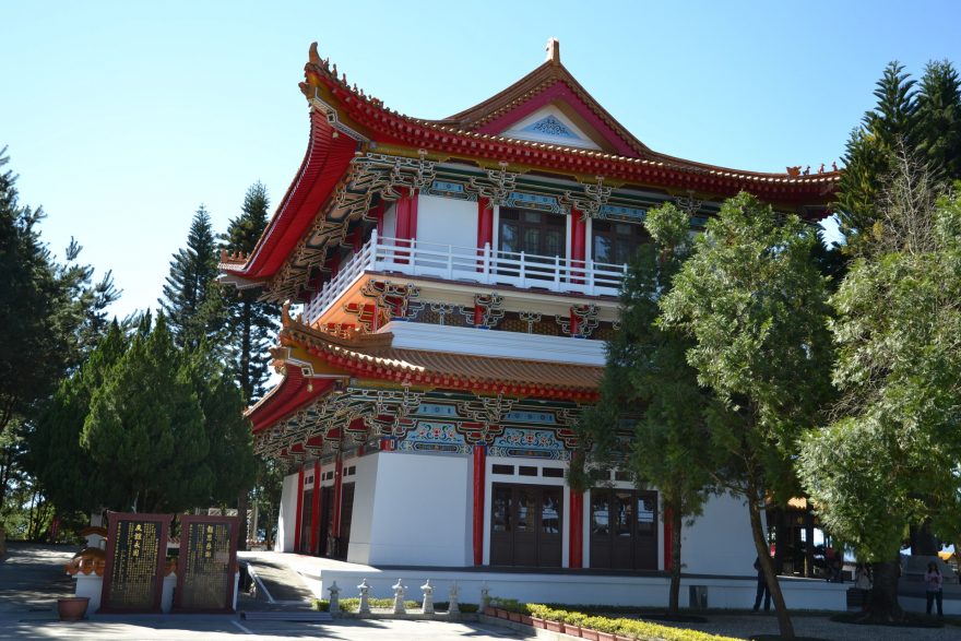 Chrám Wen-wu je za dne v obležení lidí, jezero Slunce a měsíce, Taiwan.