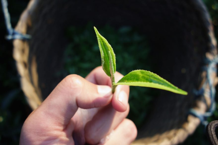 Miska čerstvě nasbíraných pupenů na bílý čaj, Ilám, východní Nepál