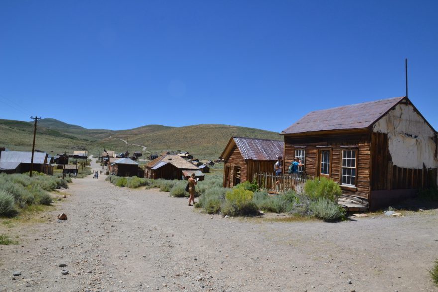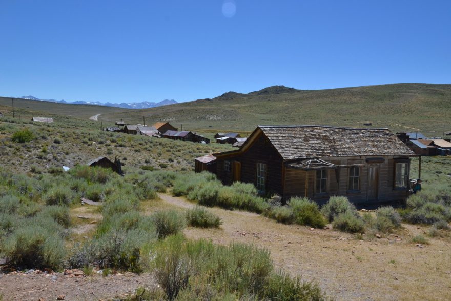 Dřevěné domky ošlehané poryvy větru připomínají kulisy amerického westernu. Bodie, USA