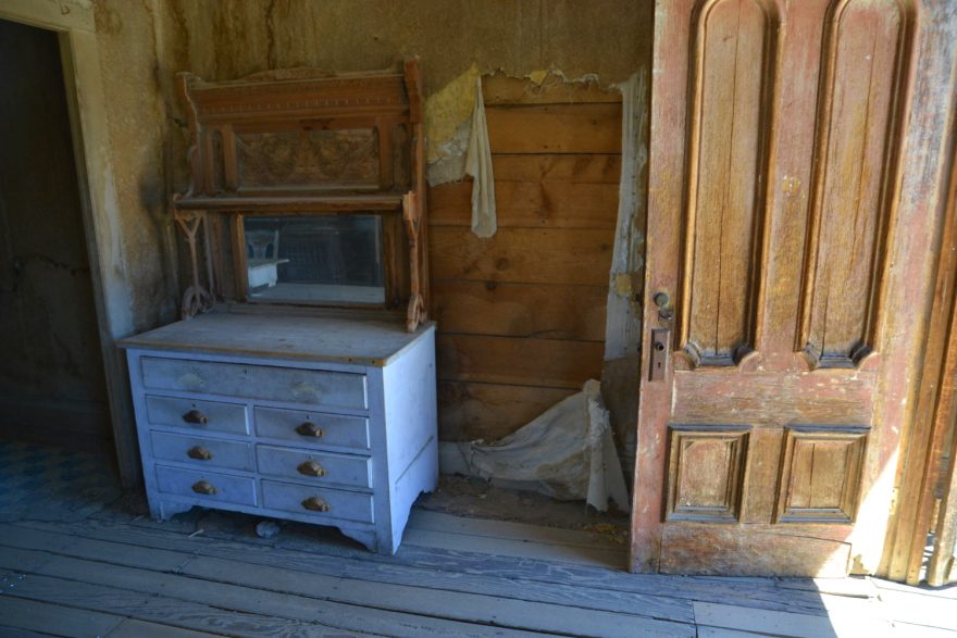 Skrz zaprášené okenní tabule nakukujeme do minulosti. Prach sedá na vyřezávané skříně a pelesti postelí. Bodie, USA