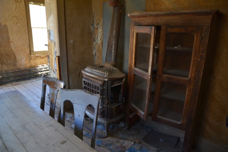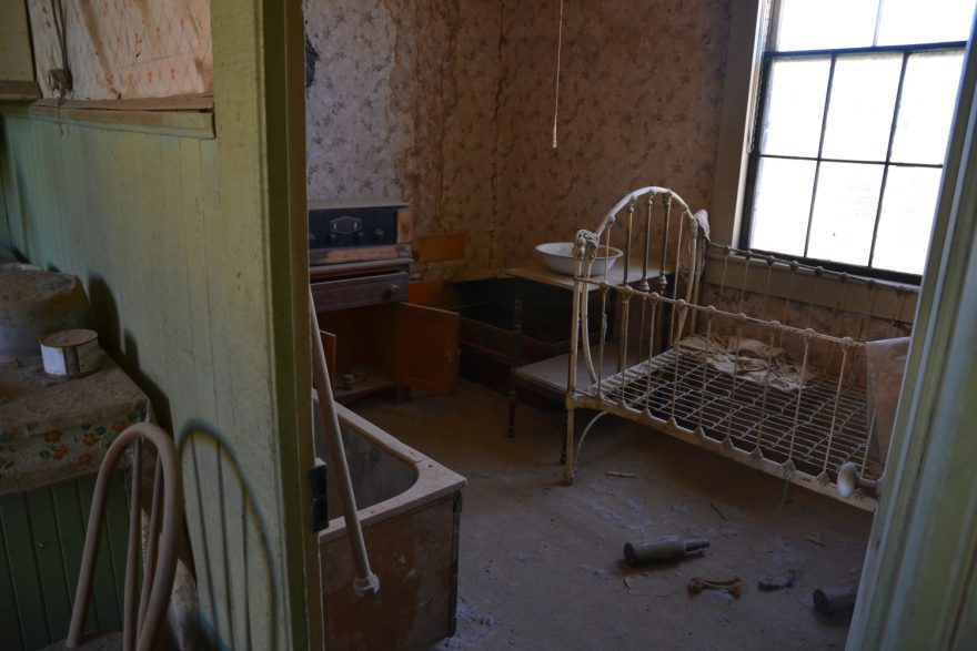 Ze zdí se odlupují květované tapety, na stropě visí petrolejka a na rozviklaném jídelní stole je prostřeno, jako kdyby jeho obyvatelé měli právě zasednout k večeři po celodenní dřině v dole.