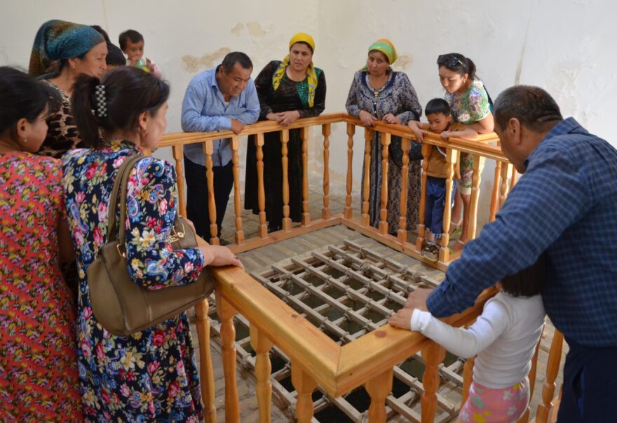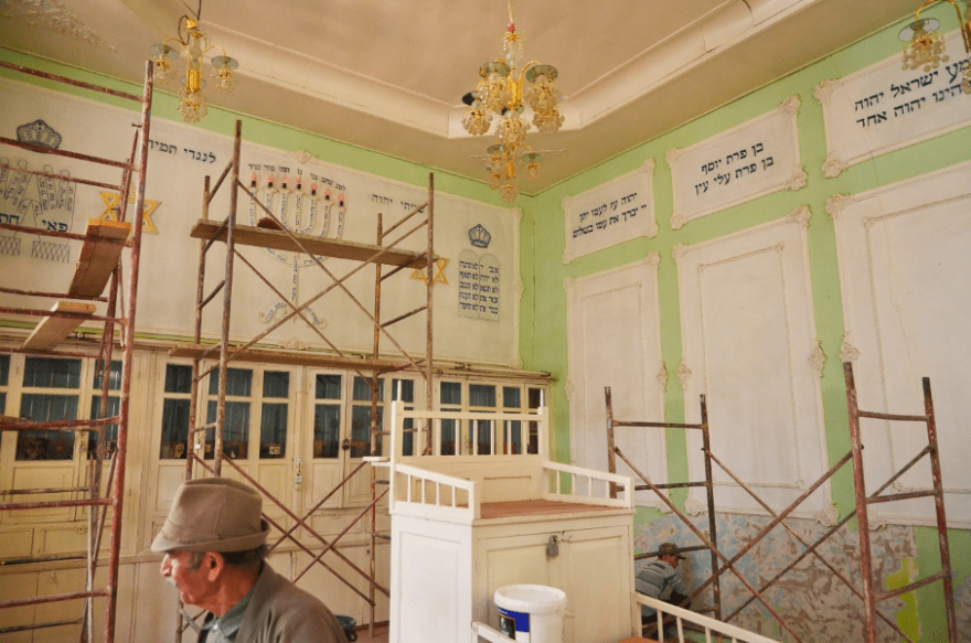 Zlatem vyšívaná textilie s počátečními slovy židovského desatera, hlavní bucharská synagoga