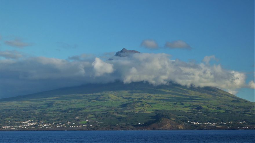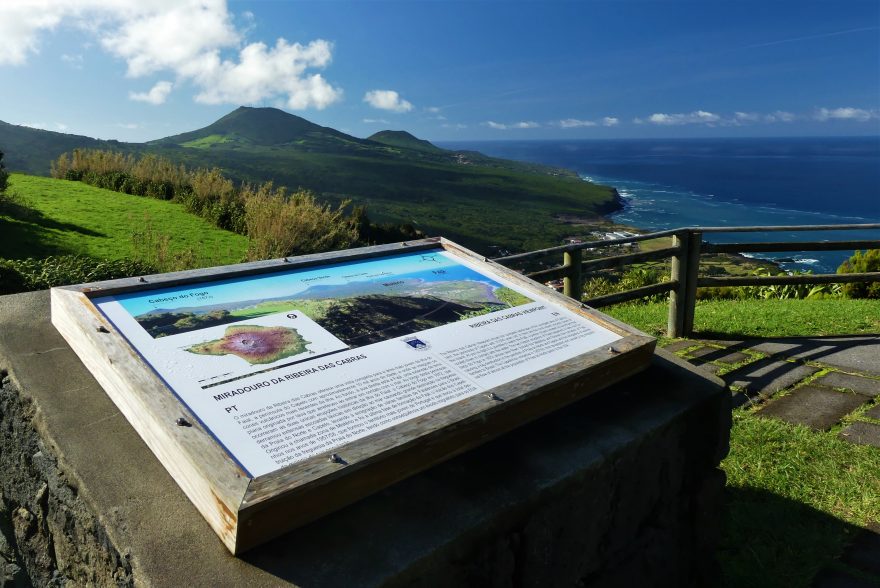 Pohled z majáku sopečné kopce a interpretační centrum, Capelinhos, Faial