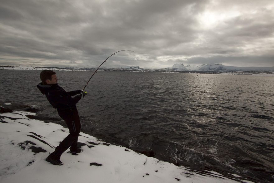 David rybaří (zasekl třpytku) ve fjordu. Skore: Ryby=0, třpytky= -2