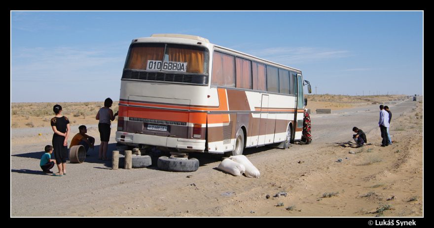 Oprava v pousti Kyzylkum, Uzbekistán