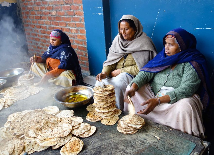 Velkovýrobna čapátí ve Zlatém chrámu v Amritsaru – běžící pečící pás