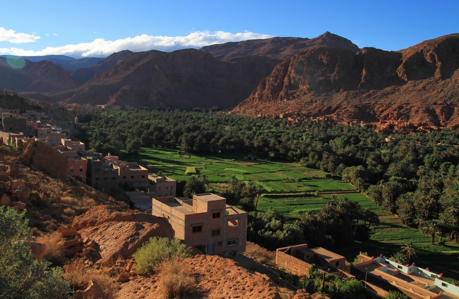 Na úpatí skal jsou nalepené vesnice, domeček na domečku, všechny hranaté, všechny v teplých tónech
