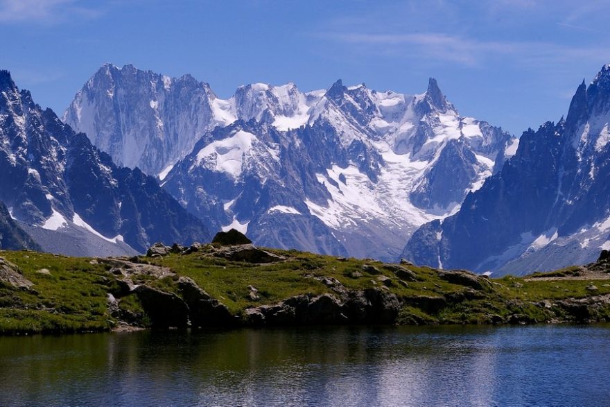 Chamonixské jehly se zrcadlí v jezeře Lac Blanc