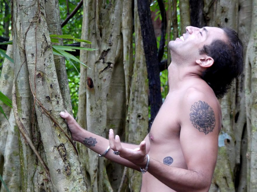 S vlastnoručně vyrobeným bubnem, na nějž hraji při ceremoniích, kde spolu s dalšími vytvářím hudební doprovod.
